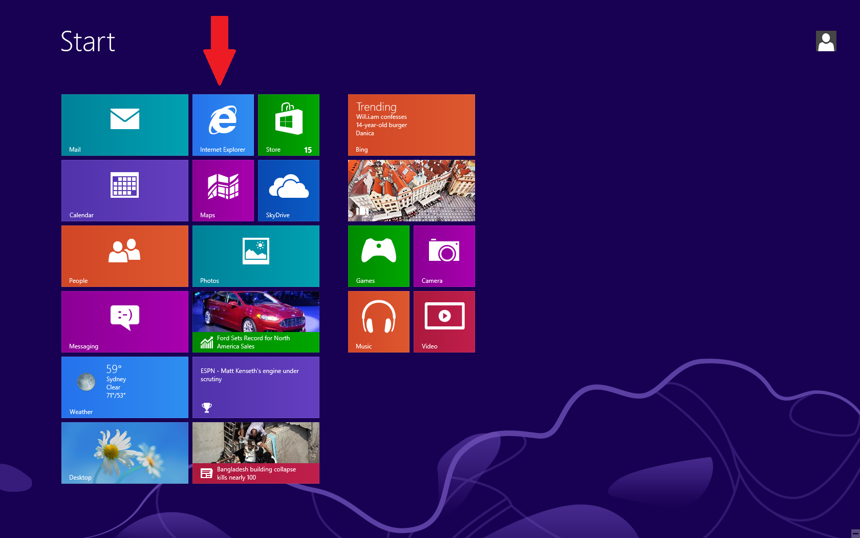 1) To start Internet Explorer from the Start Screen, click on the Internet Explorer tile as shown in the image below.